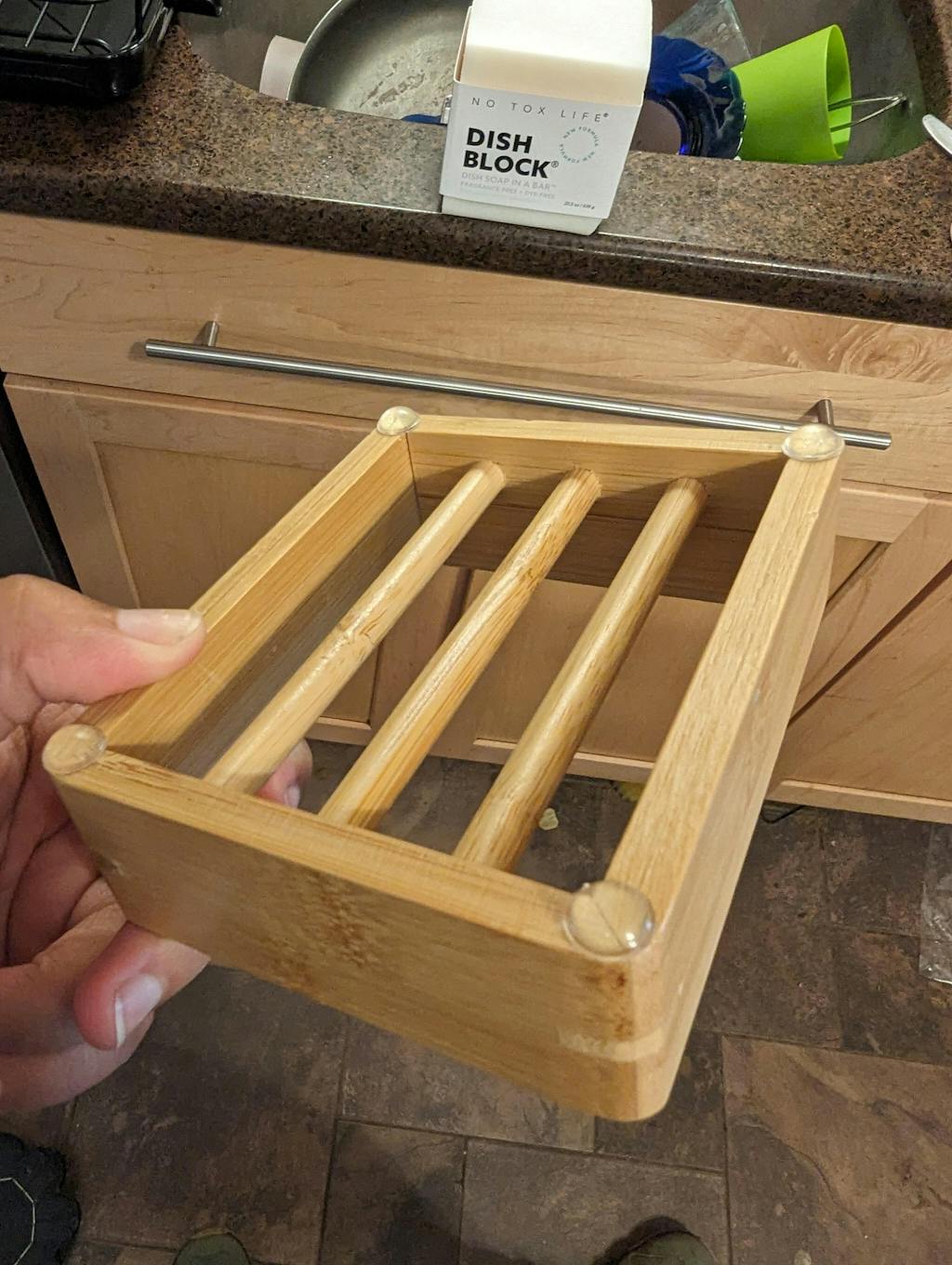 This is a beautiful thing and actually works to keep all kinds of soap from sliding off the edge of the sink into the basin. It also allows soap to drain and is made of sustainable materials. I'm buying another one to hold hand soap.